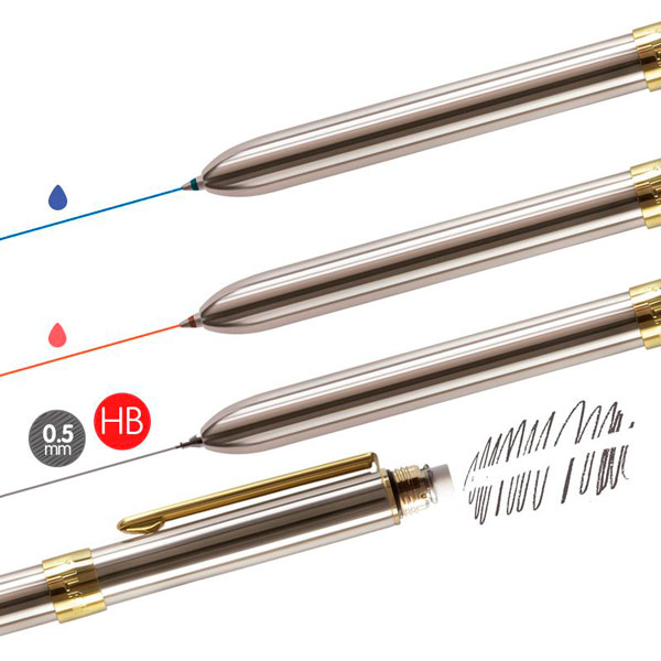 Bolígrafo con 4 funciones: bolígrafo azul 0.7 mm, bolígrafo rojo 0.7 mm, portaminas 0.5 mm HB y goma MILAN. Cuerpo de color plata cromado, aro central con logo MILAN grabado y pinza en tono dorado. La mina de las tintas lleva impreso la fecha y el año de fabricación. Fabricado en Japón. Caja metálica, ideal para regalar.
