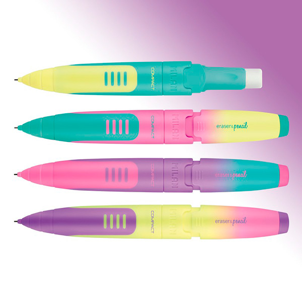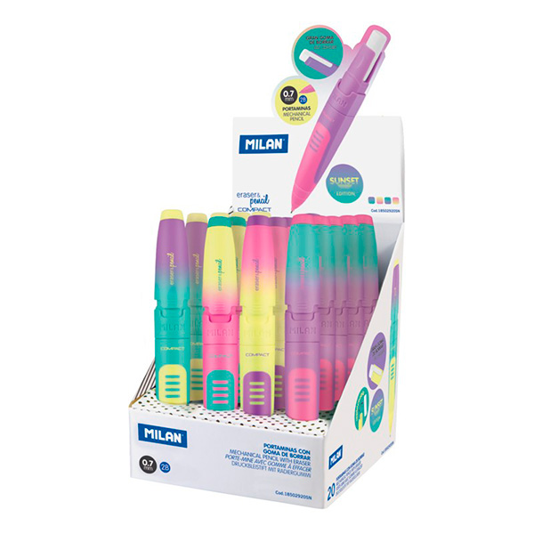 Portaminas eraser&pencil COMPACT edición Sunset. Mina de grafito 0.7 mm dureza 2B, gruesa y suave, que facilita la escritura y es también apropiada para el dibujo artístico. Goma MILAN extra-grande. Disponible en 4 colores surtidos: amarillo, lila, rosa y turquesa. Medidas portaminas COMPACT: 13 x 1,8 x 1,6 cm. Gomas y minas de recambio disponibles.