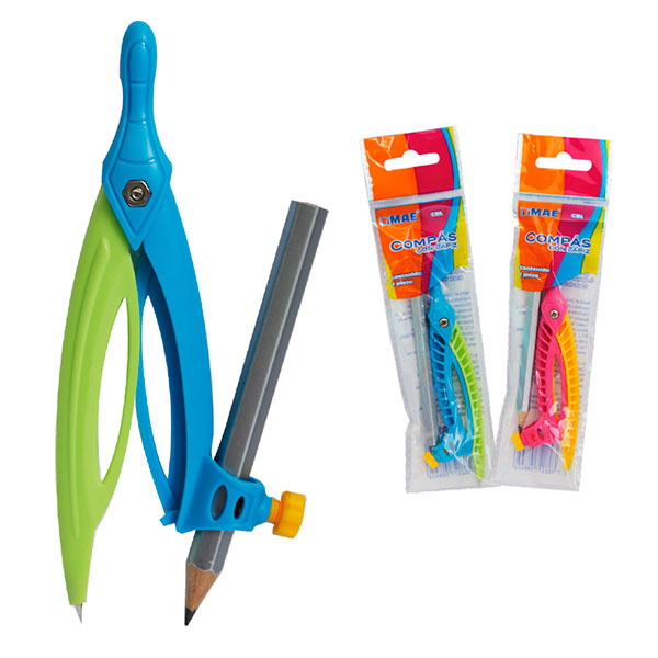 Compás escolar con lápiz. Colores surtidos: azul/verde y rosado/amarillo.