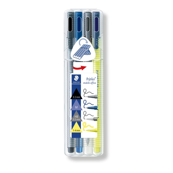 Set de 4 piezas que incluye: 1 marcador Triplus Fineliner negro, 1 bolígrafo Triplus Ball azul, 1 portaminasTriplus micro y 1 resaltador Triplus Textsurfer amarillo. Estuche plástico de sobremesa que permite tener a mano el rotulador que necesite.