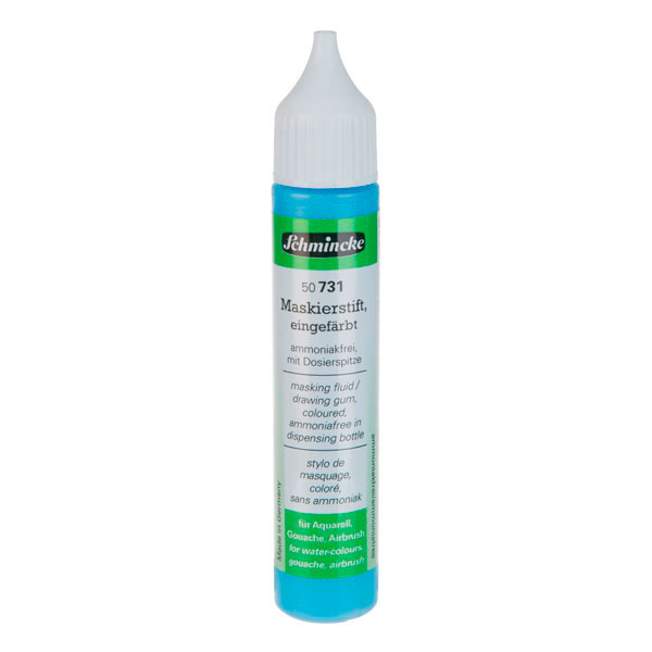 Líquido enmascarador inodoro teñido de azul para cubrir áreas de la imagen que no deben ser procesadas en papel de acuarela, cartulina de dibujo liso y bases de pintura similares. Aplicar directamente del bolígrafo dosificador con punta fina.