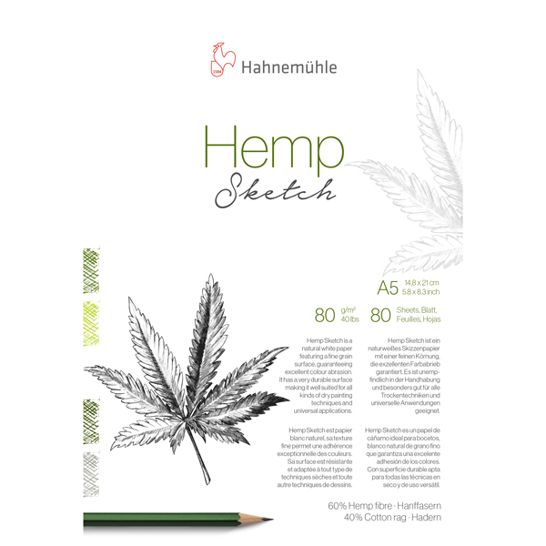 Hemp Sketch es un papel de dibujo blanco natural y de grano fino, con excelente adherencia del color. Debido al uso de fibras de cáñamo, el papel de 80 g/m² ofrece una alta resistencia. Es adecuado para todas las técnicas en seco con grafito, tiza roja, lápiz de color y carboncillo y es fácil de borrar. Hemp Sketch es un papel de dibujo de primera clase y único en su rango, debido a sus excelentes propiedades y sostenibilidad. Al utilizar fibras de cáñamo como materia prima, se conservan otros recursos naturales de lento crecimiento. Todos los blocs de dibujo de la línea Hemp Sketch contienen 80 hojas y están encolados en la parte superior.