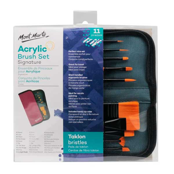 El juego de pinceles para acrílico Mont Marte es una hermosa selección de pinceles con cerdas de taklon ideales para proyectos de acrílico. El práctico estuche con cremallera es perfecto para viajar y ayuda a prolongar la vida útil de las brochas.