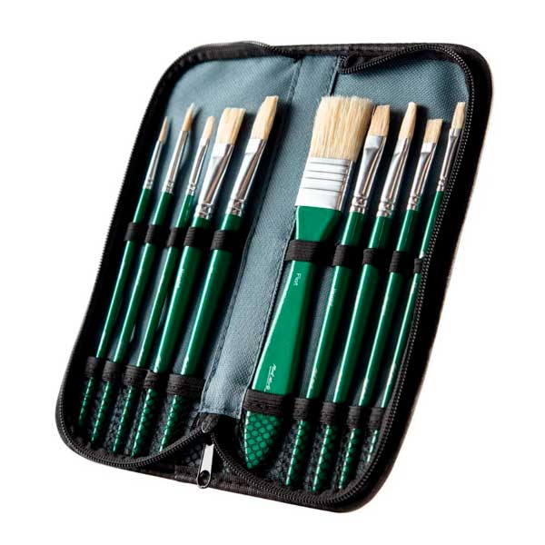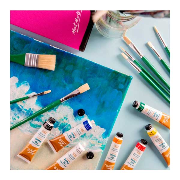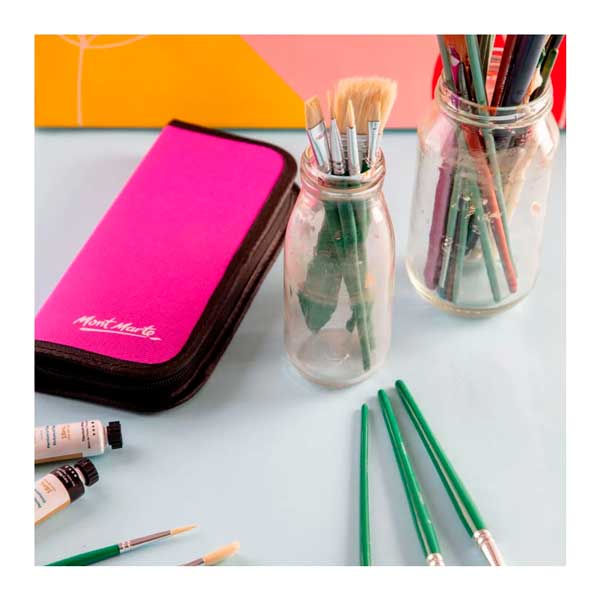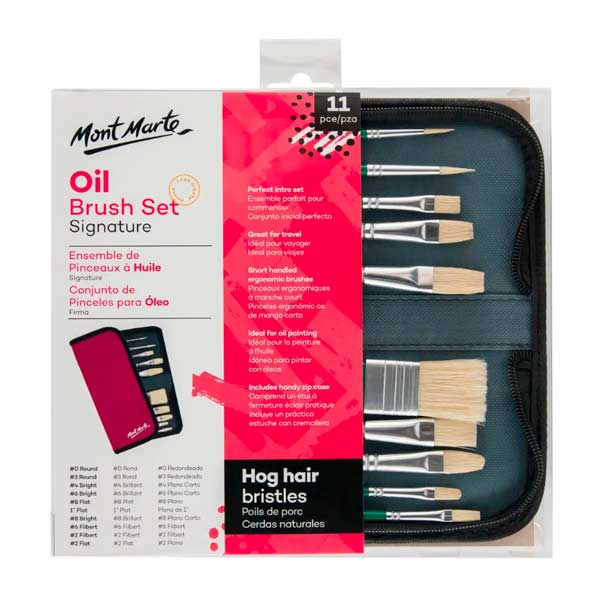 El juego de brochas para óleo Mont Marte es una hermosa selección de brochas con cerdas de pelo de cerdo ideales para proyectos al óleo. El práctico estuche con cremallera es perfecto para viajar y ayuda a prolongar la vida útil de las brochas.