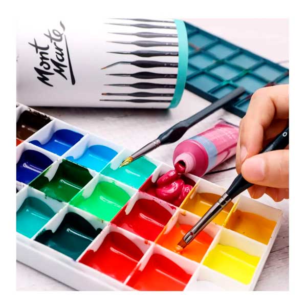 Cuidado del pincel (pinturas acrílicas, gouache y acuarelas): Limpiar con agua jabonosa tibia y remodelar cuando haya terminado.