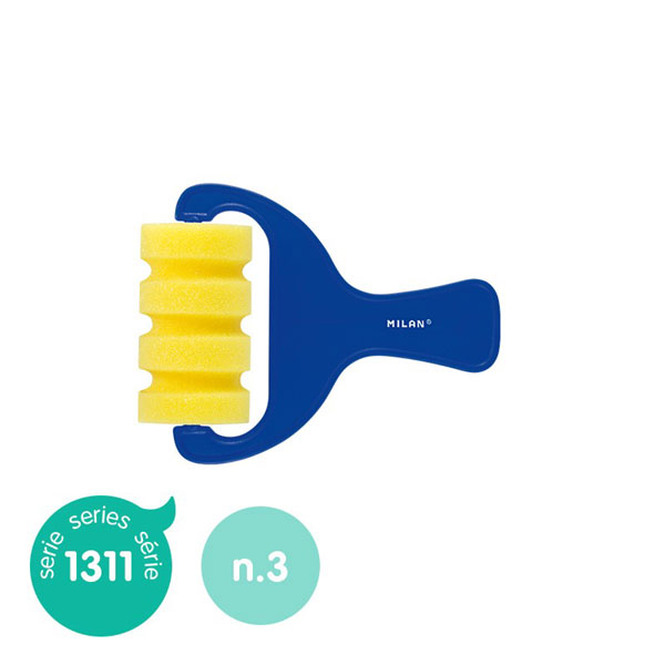 Rodillo de esponja con franjas verticales y mango corto de plástico azul. Adecuado para témpera, acuarela y técnicas acuosas. Ancho: 71 mm. Diámetro del rodillo: 43 mm. Longitud total: 144 mm