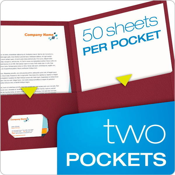 Las carpetas de dos bolsillos contienen hasta 50 hojas de papel tamaño carta en cada bolsillo.
