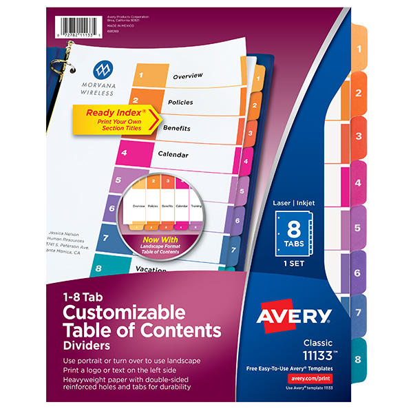 Los Separadores Prediseñados Ready Index® son ideales para organizar tus documentos alfabeticamente, estos separadores cuentan con un índice personalizable en el cual podrás imprimir el contenido utilizando las plantillas gratuitas ingresando a avery.com/templates. Estos separadores son la solución perfecta para clasificar tus documentos e identificarlos rápidamente ya que la tabla de contenido y sus divisiones las puedes utilizar de forma horizontal o vertical.