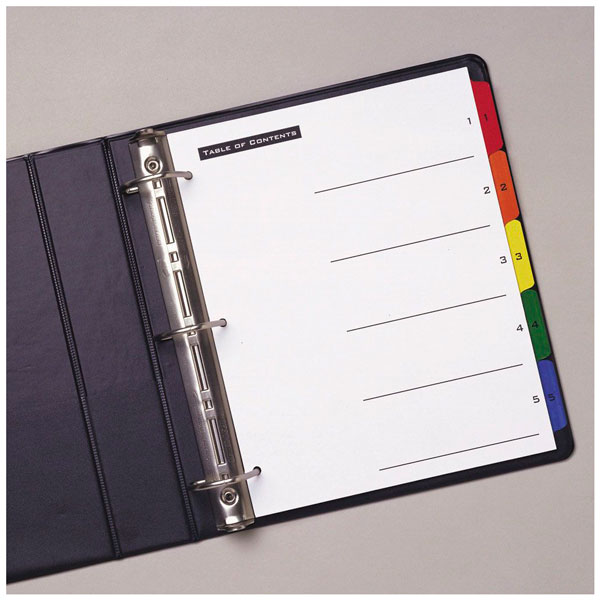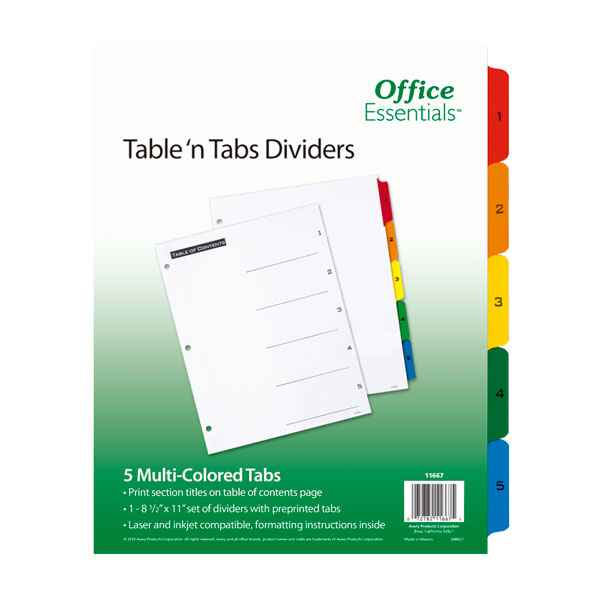 Organiza tus documentos de forma rápida y fácil con los separadores prediseñados Office Essentials. Estos separadores numéricos del 1 al 5 son tamaño carta y cuentan con pestañas multicolor, además incluyen una tabla de contenido, la cual podrás personalizar e imprimir en impresoras láser o inyección de tinta, personaliza tu índice ingresando a avery.com/templates. Los separadores Office Essentials están elaborados con 30% de papel reciclado post-consumo.