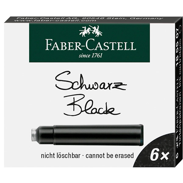 Para pluma fuente con sistema de cartuchos estándar; Tintas de calidad made in Germany; 6 cartuchos por caja; Color: negro